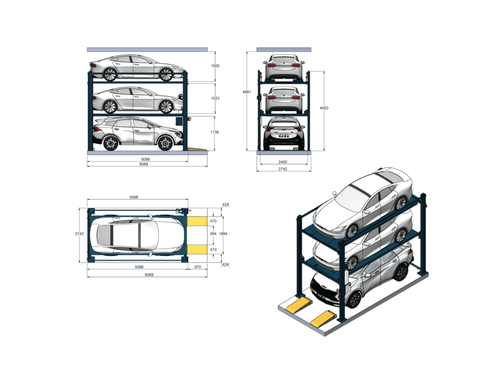 Dependent hydraulic driven car parking lift for 3 cars vertical parking.
